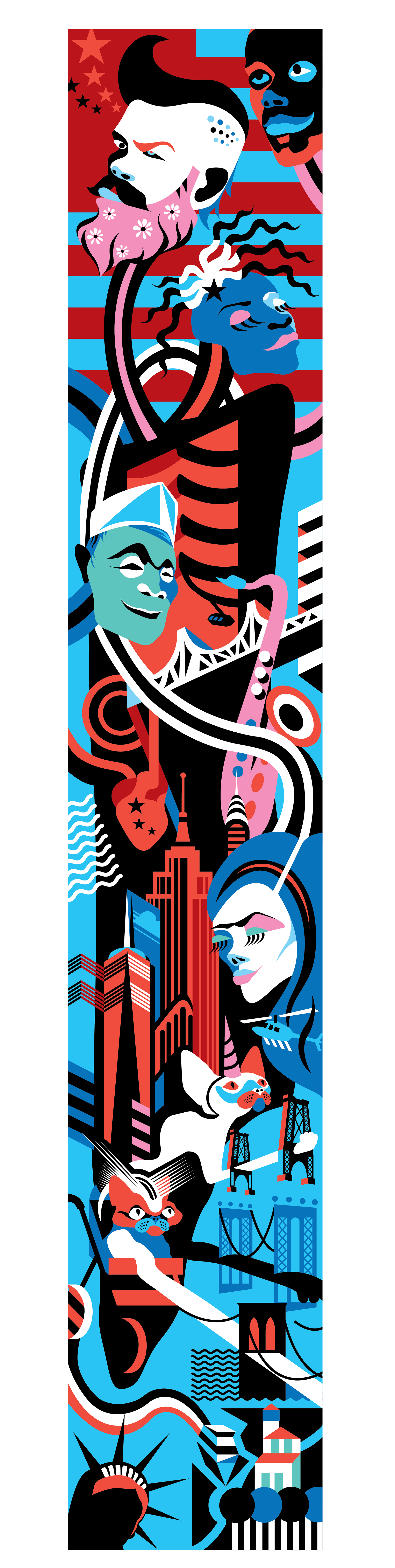 The illustration below was for the Moxy Hotel in Times Square, New York. It was part of a global project to find artwork for the outside of the building. The 120' high artwork was to be printed on mesh and hung above the entrance to the hotel.